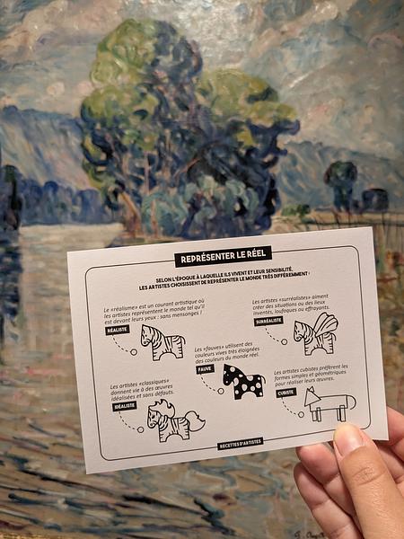 Au programme : se déguiser comme un peintre, réaliser une œuvre cubique, retrouver des détails, composer sa nature morte, créer un cadavre exquis, se lancer des défis, reconnaître les matériaux utilisés par les artistes par l'odorat...)