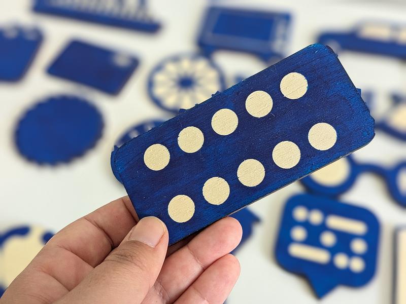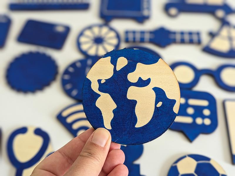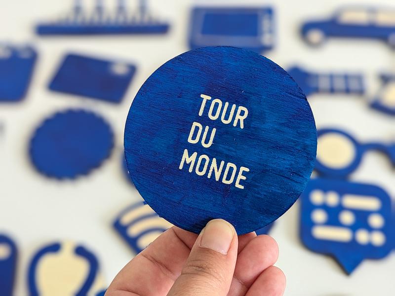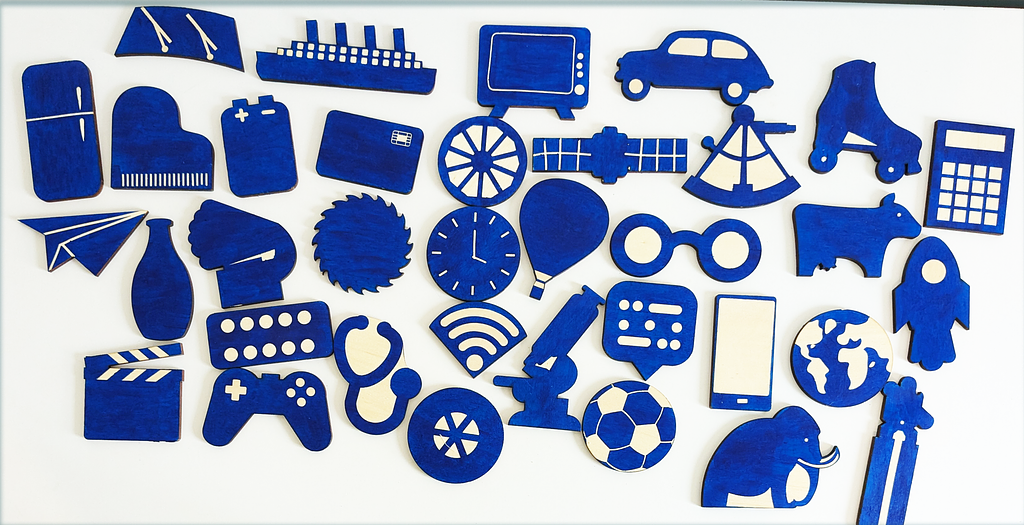 72 pions découpés à la laser représentent certaines des grandes (ou petites) inventions de l'histoire de l'humanité dans des domaines divers : santé, transport, science, art ...